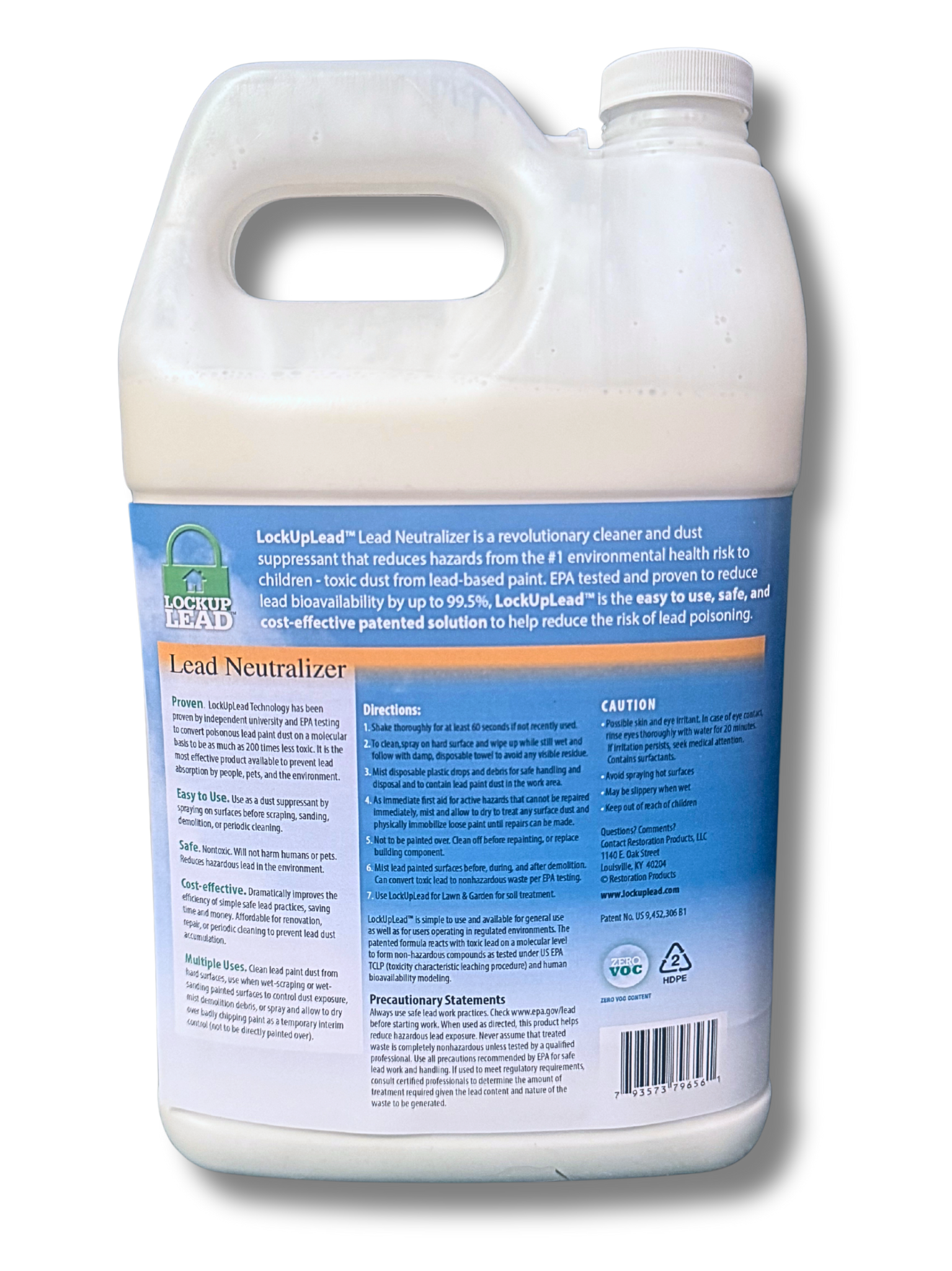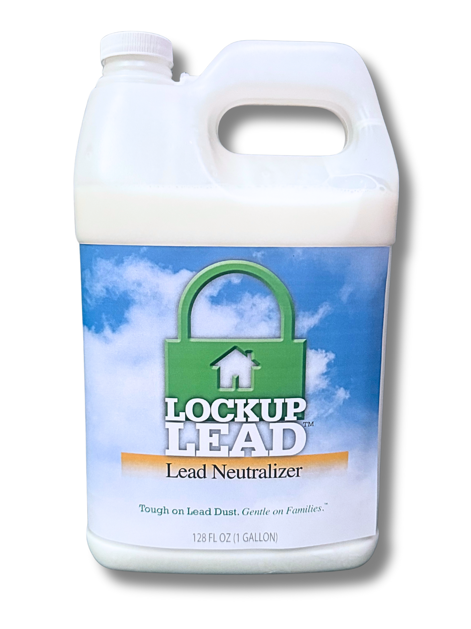 Neutralize Harmful Lead Dust on Contact... gallon-sized. Ideal for refilling our spray bottle or standard pump sprayer. LockUpLead™ Home Lead Neutralizer is a revolutionary cleaner and dust suppressant that reduces hazards from the #1 environmental health risk to children - toxic dust from lead-based paint. EPA tested and proven to reduce lead bioavailability by up to 99.5%, LockUpLead™ is the easy to use, safe, and cost-effective patented solution to help reduce the risk of lead poisoning.