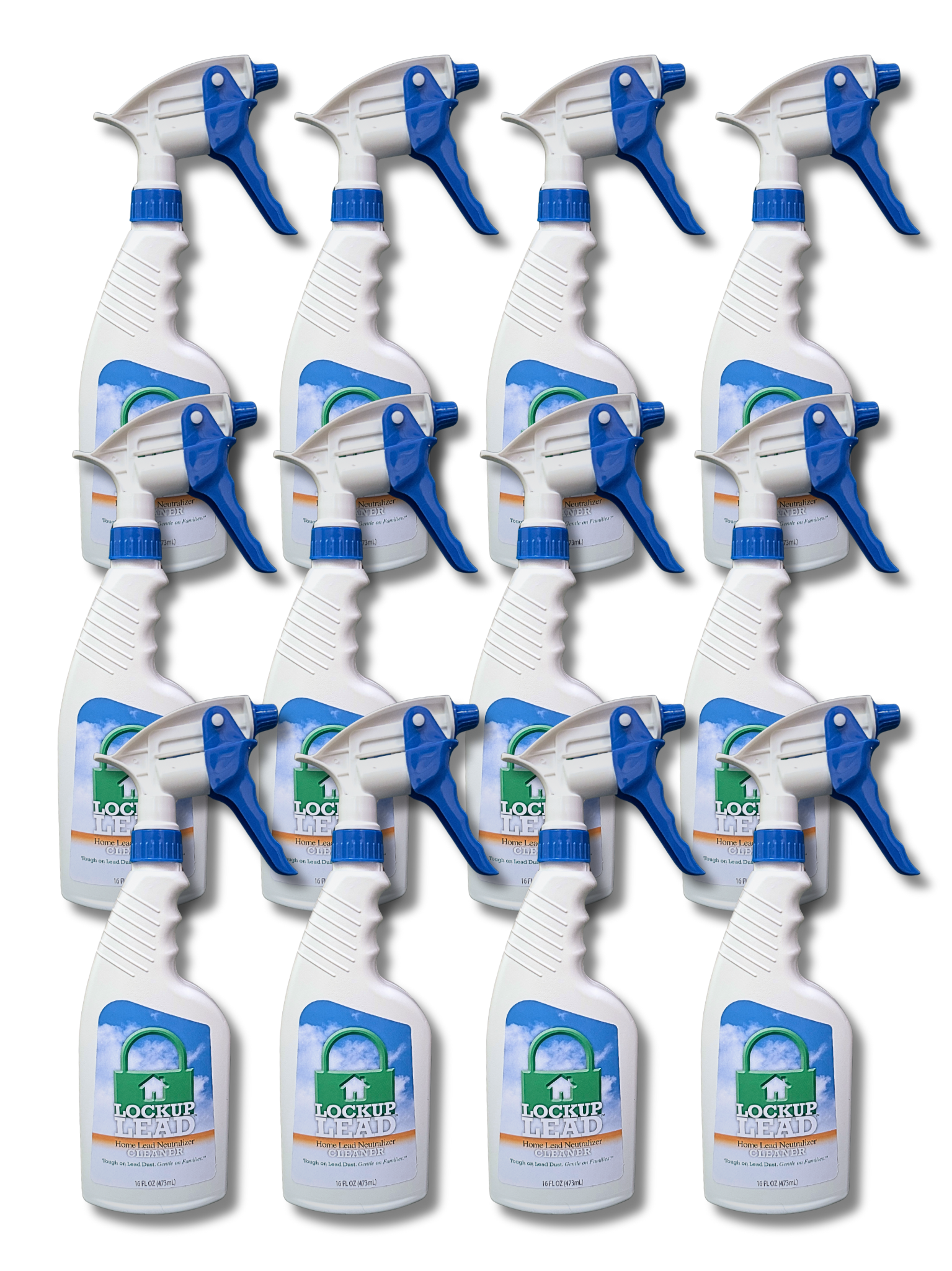 Neutralize Harmful Lead Dust on Contact... a case of 12 bottles ready for distribution to multiple people or large projects! LockUpLead™ Home Lead Neutralizer is a revolutionary cleaner and dust suppressant that reduces hazards from the #1 environmental health risk to children - toxic dust from lead-based paint. EPA tested and proven to reduce lead bioavailability by up to 99.5%, LockUpLead™ is the easy to use, safe, and cost-effective patented solution to help reduce the risk of lead poisoning. Our refillable16 oz. spray bottle is the perfect size for cleaning window sills, door jams and tools. Great for small wet sanding jobs, too!